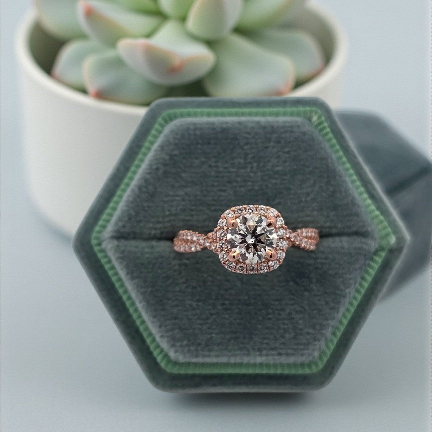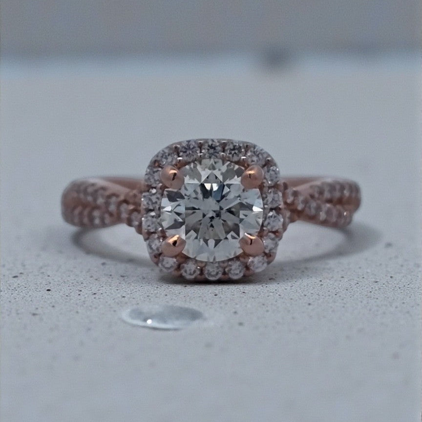 Set in an elegant infinity-style semi-mount, the design incorporates a delicate halo of round diamonds that enhances the center stone and symbolizes endless love. The rose gold metal adds a soft, feminine touch, making this ring both modern and timeless.